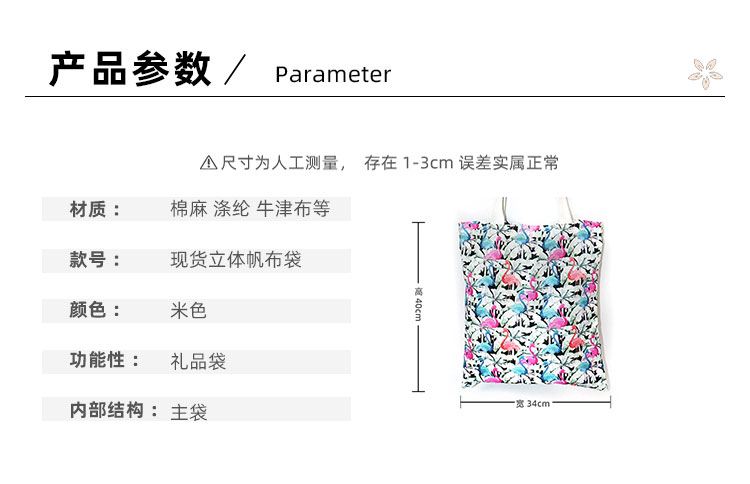 【價格說明】 客戶定制規格尺寸、印刷工藝、布料材質、數量等確定價格; 【規格尺寸】 可根據客戶需要定制; 【產品顏色】 可提供色卡給客戶確認顏色,數量較大時候,可定制布料顏色; 【印刷工藝】 可為客戶印刷LOGO、文字,印刷工藝為絲網印、燙畫轉印、數碼升華彩色轉印、數碼彩色直噴、覆膜彩印; 【產品用途】 可作為促銷禮品贈品、產品包裝、購物袋等; 【產地說明】 廣州生產,廣州發貨,可發物流、快遞、可上門提貨;